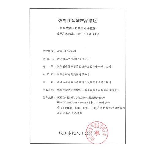 GGJ低压无功功率补偿柜(低压成套无功功率补偿装置)强制性认证产品描述
