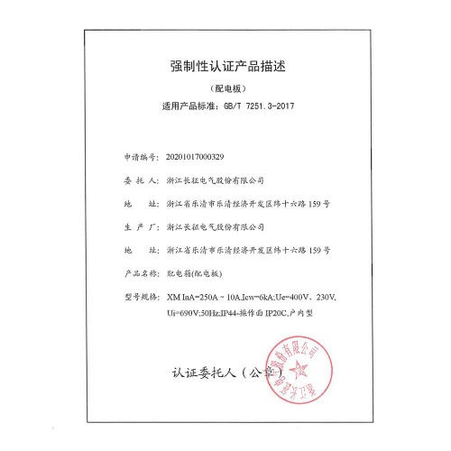 XM 250-10A配电箱强制性认证产品描述