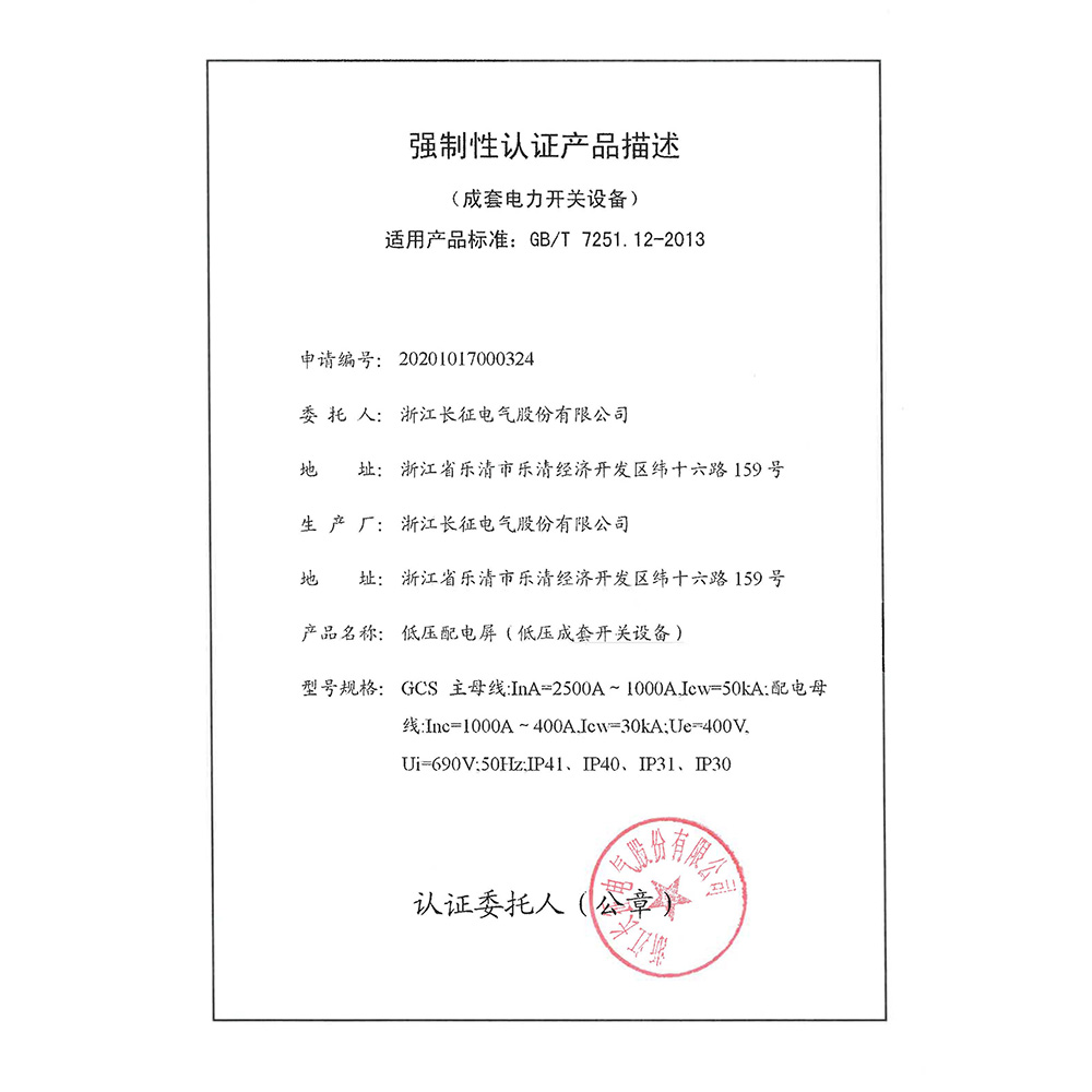 GCS低压配电屏(低压成套开关设备)强制性认证产品描述