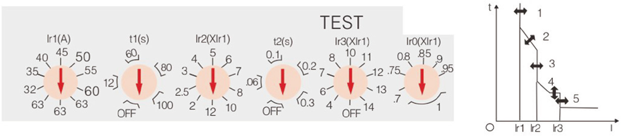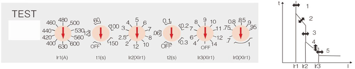 1、过载长延时动作电流 Ir1 调整根据断路器不同的额定电流可从 4 档到 10 档进行调整;